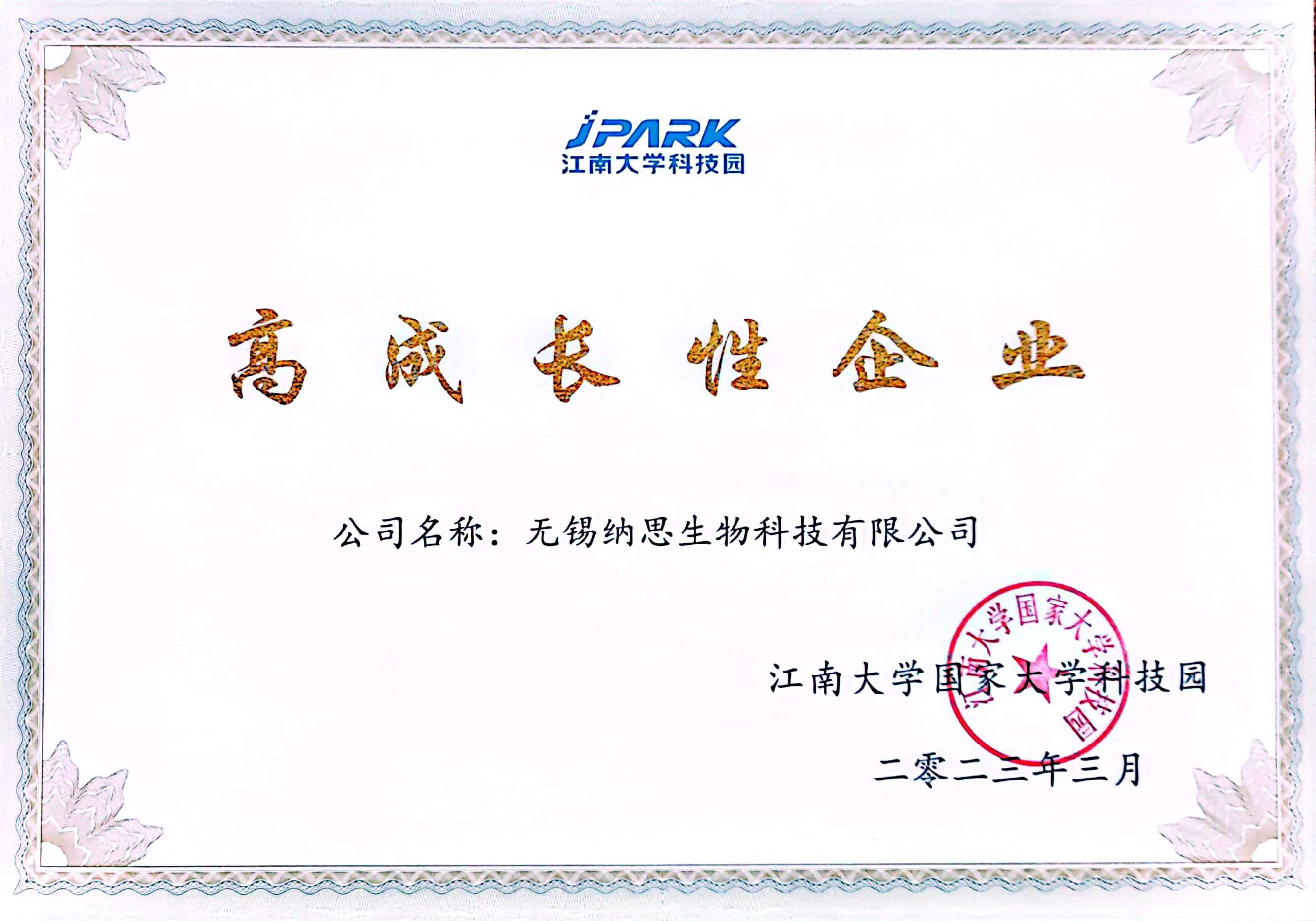 獲得江南大學科技園“高成長性企業(yè)”稱號